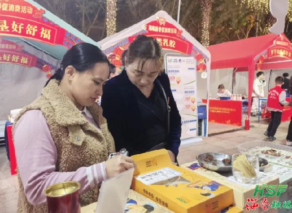 工作人員向消費者介紹“海墾福豬”臘肉產品。黃薇 攝