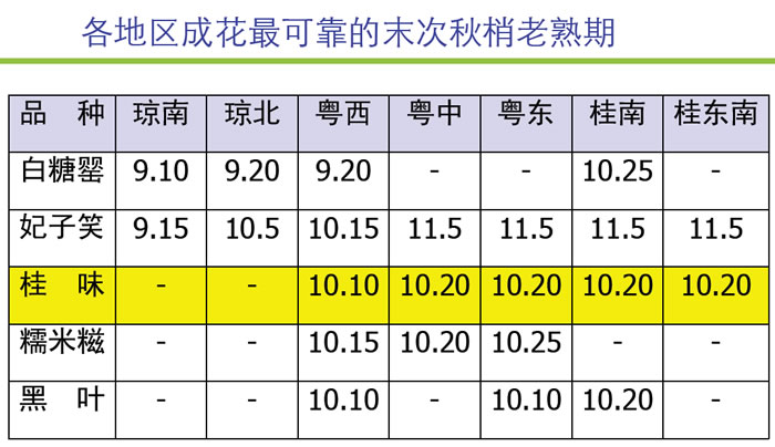 原因分析:秋冬季日照時間長、光照充足、天氣溫暖,是荔枝光合積累的黃金時期。貯藏碳水化合物除滿足成花需求之外,也供給開花和初期坐果之需。荔枝在葉片轉綠之后才能進入凈光合狀態。以見 “白點”時間為節點,秋梢老熟時間越長,凈光合積累時間越長,積累和貯藏碳水化合物量越多。