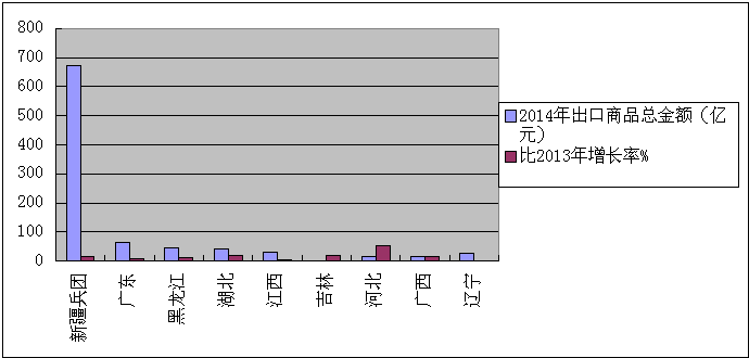 2014年全國農墾農產品出口排名前十的墾區是:新疆兵團、廣東、黑龍江、湖北、江西、遼寧、廣西、河北、上海、北京。十大墾區出口商品總金額合計926.49億元,占全國農墾出口商品總金額944.84億元的98.06%。