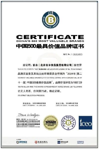 6月19日,第二十一屆“世界品牌大會”在北京舉行,會上發布了2024年《中國500最具價值品牌》分析報告。在這份基于財務數據、品牌強度和消費者行為分析的年度報告中,“首農”2024年的品牌價值為1087.59億元,總排名位列500強第75位,品牌價值突破千億元。