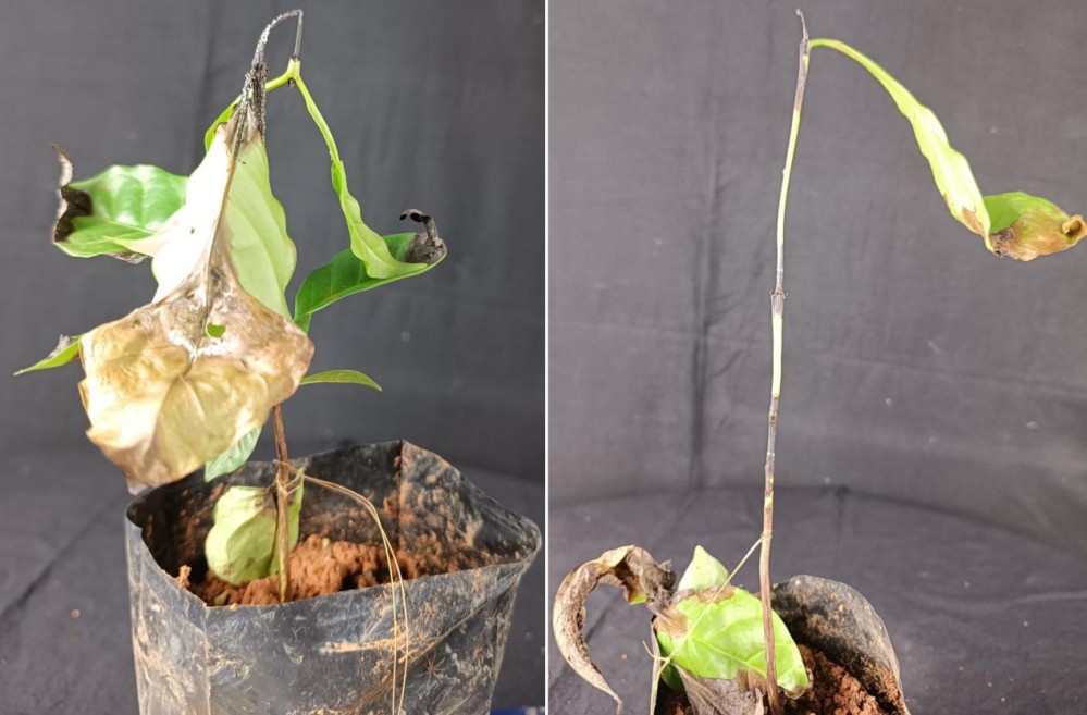 發病初期,葉片表面出現水漬狀斑點,擴展較快,3~5 天后病斑中央呈灰白色至褐色,邊緣暗褐色。典型病斑呈深淺交替同心輪紋狀,正背面相似,病斑下陷、易破裂。發病葉片病健交界處有明顯黃色暈圈(圖1),病斑輪紋處常生白色小顆粒,分生孢子座為墨綠色至黑色,菌絲為白色(圖2)。發病后期,病斑蔓延至整個葉片乃至莖干,造成葉片掉落,嚴重時咖啡整株死亡(圖3)。該病常與咖啡炭疽病混發,加重危害。