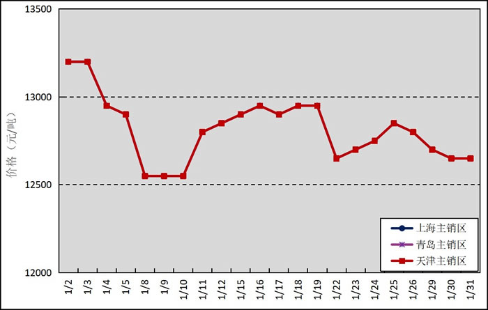 國內(nèi)主銷區(qū):1月,國產(chǎn)全乳標(biāo)準(zhǔn)膠上海市場平均價格12816元/噸,環(huán)比上漲202元/噸,最高價為13200元/噸,最低價為12550元/噸;青島市場平均價格12816元/噸,環(huán)比上漲202元/噸,最高價為13200元/噸,最低價為12550元/噸;天津市場平均價格12816元/噸,環(huán)比上漲202元/噸,最高價為13200元/噸,最低價為12550元/噸。