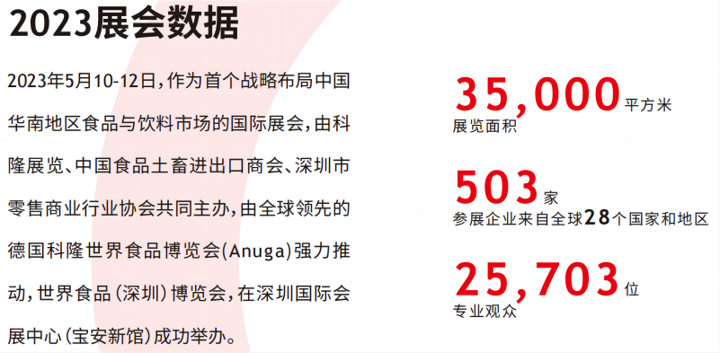 由德國科隆世界食品博覽會(Anuga)強(qiáng)力推動,科隆展覽、中國食品土畜進(jìn)出口商會、深圳市零售商業(yè)行業(yè)協(xié)會共同主辦,ANUFOOD China 2023世界食品(深圳)博覽會于2023年5月10-12日在深圳國際會展中心(寶安新館)順利舉辦。本屆展會累計吸引25,703位食飲行業(yè)人士觀展,展覽總面積達(dá)到35,000平方米,參展企業(yè)數(shù)量達(dá)503家,來自全球近30個國家和地區(qū),涵蓋甜食及休閑食品、肉類、乳制品、精細(xì)食品、海產(chǎn)及冷凍食品、植物基及健康食品、咖啡與茶、飲料(酒精與非酒精)、食品與飲料技術(shù)、餐飲服務(wù)與技術(shù)等食品與飲料全產(chǎn)業(yè)鏈。同期還舉辦歐洲最大的烘焙咖啡行業(yè)盛會SIGEP在華子展——SIGEP China深圳國際手工冰淇淋、烘焙及咖啡展覽會。