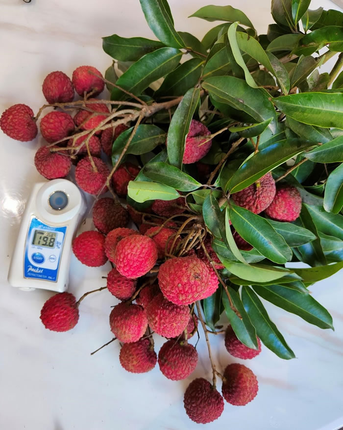 專家組在福建省漳州市云霄縣東廈鎮東崎村清堯家庭農場進行現場測產與品質鑒定,認真聽取了選育團隊對‘鳳山紅燈籠’荔枝新品種選育情況的匯報,就有關問題進行了質詢與討論,經現場測產,2003年高接的18年生樹平均株產108.4kg、折合畝產1518.1kg、平均單果重22.2g、 焦核率82.0%、可溶性固形物19.1%、可食率84.3%;果實肉質細嫩、清甜多汁,品質優。一致同意該品種通過現場鑒評。