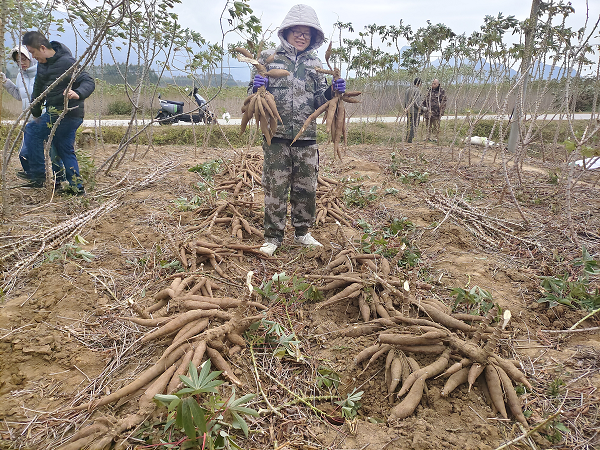 模式創新,凝聚發展之力。兩江鎮采用“專家+農戶”合作模式,引進國家木薯產業體系專家與農戶緊密合作,農戶提供土地,專家不定期到場提供技術支持,共同試驗種植高產新品種。今年,漢安村合作片區合作模式下的木薯種植基地面積達到了500畝,帶動周邊超100戶農戶參與,預計2025年種植面積將達3000畝以上。合作模式不僅突破了農戶種植技術的難關,也搭建起銷售的橋梁。新模式下,用新品種、新技術種植的木薯一上市便被搶購一空,收購價格比傳統種植模式下的木薯高出30%,帶動廣大農戶增收致富。