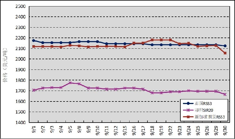 國外主產區:9月,泰國RSS3平均價格為2146美元/噸,環比下跌40美元/噸,最高價為2175美元/噸,最低價為2125美元/噸;印尼SIR20平均價格為1712美元/噸,環比上漲30美元/噸,最高價為1775美元/噸,最低價為1665美元/噸;新加坡RSS3期貨主力合約月均結算價格為2131美元/噸,環比下跌36美元/噸,最高價為2181美元/噸,最低價為2056美元/噸。