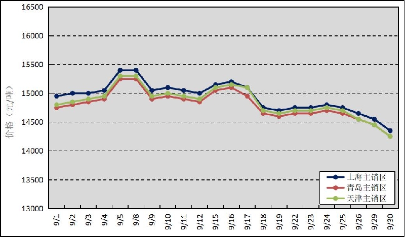 國內主銷區:9月,國產全乳標準膠上海市場平均價格14932元/噸,環比上漲206元/噸,最高價為15400元/噸,最低價為14350元/噸;青島市場平均價格14802元/噸,環比上漲274元/噸,最高價為15250元/噸,最低價為14250元/噸。天津市場平均價格14850元/噸,環比上漲274元/噸,最高價為15300元/噸,最低價為14250元/噸。