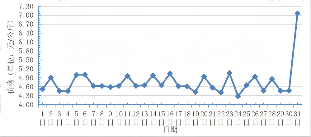 10月,全國重點監測農產品批發市場香蕉總交易量達2.3萬噸,同比基本持平,環比上漲4.5%;總交易價值12401.1萬元,同比下降19.2%,環比下降0.9%。日平均價格最高為7.0元/千克,最低為4.3元/千克,全月平均價格為 4.8元/千克,同比下降30.4%,環比下降4.0%(每日價格變化如圖)。