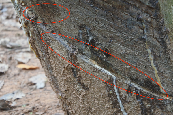 割面條潰瘍病主要危害割面,每年3-12月均可發生,發病初期在橡膠樹割面新割線上出現一條至數條排列成柵欄狀的豎立黑線,深達木質部。黑線繼續擴展成病斑或塊斑,天氣潮濕時,病斑表面長出白色霉狀物。皮下溢膠可導致皮層爆裂、隆起,木質部變黑褐色。