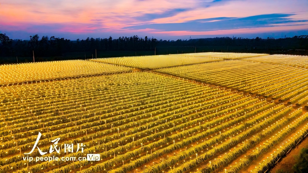立冬時節,北海市合浦縣石灣鎮清水村火龍果種植基地利用現代化科技在夜間給火龍果補光,促進火龍果的光合作用,讓火龍果擁有良好的生長環境,進一步提高火龍果產量,增加出果批次,助力果農增產增收。林啟波攝(人民圖片網)