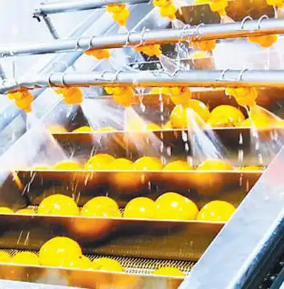在浙江艾佳果蔬開發(fā)有限責(zé)任公司,胡柚正在生產(chǎn)線上進行清洗。