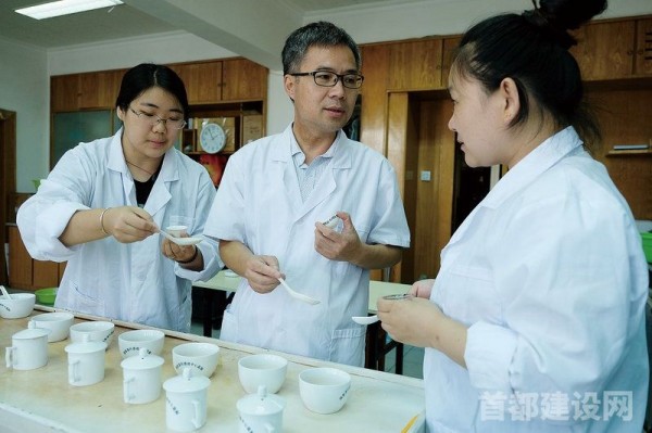京華茶業(yè)公司總經理助理、“北京茉莉花茶拼配工藝”非物質文化遺產項目第七代傳承人樓國柱(中)進行茶葉審評。