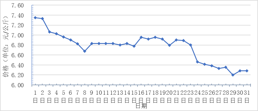 7月,全國重點監測農產品批發市場香蕉總交易量達2.1萬噸,同比上漲5%,環比下降8.7%;總交易價值 13613.1萬元,同比上漲6.5%,環比下降11.3%。日平均價格最高為7.4元/千克,最低為6.2元/千克,全月平均價格為 6.8元/千克,同比上漲23.6%,環比上漲1.5%(每日價格變化如圖)。
