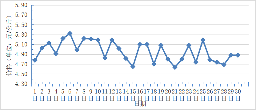 9月,全國重點監測農產品批發市場香蕉總交易量達2.2萬噸,同比上漲4.80%,環比下降4.3%;總交易價值12518.2萬元,同比下降9.1%,環比上漲6.1%。日平均價格最高為5.3元/千克,最低為4.7元/千克,全月平均價格為 5.0元/千克,同比下降25.4%,環比基本持平(每日價格變化如圖)。
