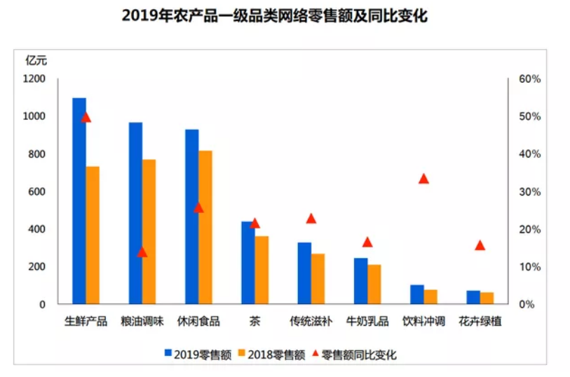 《報告》數據顯示,2019年全國農產品網絡零售額達4168.6億元,其中生鮮產品消費占比在飛速上升。同期生鮮產品網絡零售額超過1094.9億元,網絡零售量同比增加78.4%,成為規模最大、增速最快的類目。