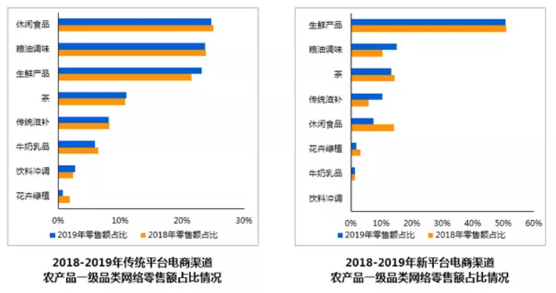 《報告》分析,傳統電商平臺中,農產品網絡銷售前三大品類依次為休閑食品、糧油調味、生鮮產品,占比分別為25%、23.8%、21.5%。但以拼多多為代表的新電商平臺以及新零售渠道中,生鮮產品的網絡零售額占比均超過50%,而傳統電商平臺生鮮產品零售額占比不足25%。